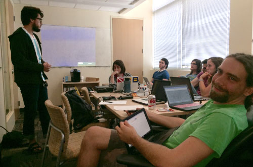 Space Group meetings stress speaking skills and scientific discussion. Clockwise from left: Luciano Laratelli, Alexis Johnson, Douglas Franz, Sean Carter, Matthew Mostrom, Jessica Rose, Adam Hogan. A complete list of our current students is presented here.